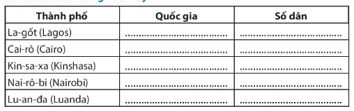 Hãy tìm thông tin về quốc gia và số dân của một số đô thị ở châu Phi và điền vào bảng dưới đây: