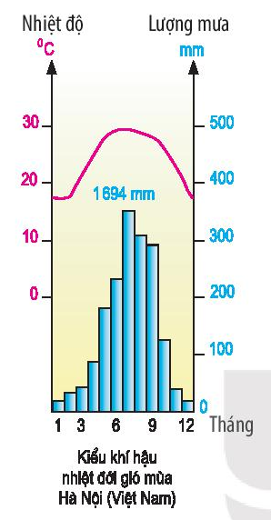 Quan sát hình 10.2 biểu đồ kiểu khí hậu nhiệt đới gió mùa Hà Nội (Việt Nam) để nhận xét về đặc điểm nhiệt độ và lượng mưa