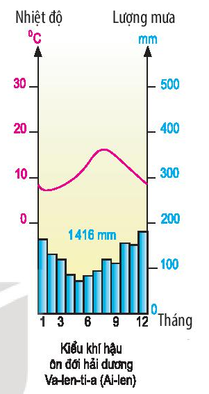 Quan sát hình 10.2 biểu đồ kiểu khí hậu ôn đới hải dương Va-len-ti-a (Ai-len) để nhận xét về đặc điểm nhiệt độ và lượng mưa. Sử dụng phương pháp loại trừ.