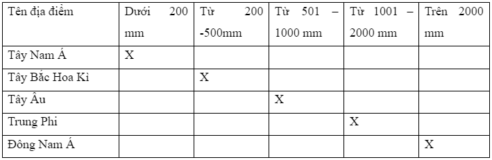 Dựa vào hình 10.2 trong SGK, em hãy điền tên một số địa điểm trên các lục địa có lượng mưa trung bình năm khác nhau vào bảng sau