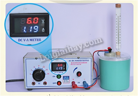 Một học sinh mắc dây điện trở của nhiệt lượng kế với hai cực của nguồn điện như hình 10.5. Biết rằng, các giá trị hiển thị trên màn hình của nguồn điện là cường độ dòng điện chạy trong mạch và hiệu điện thế giữa hai cực của nguồn.
