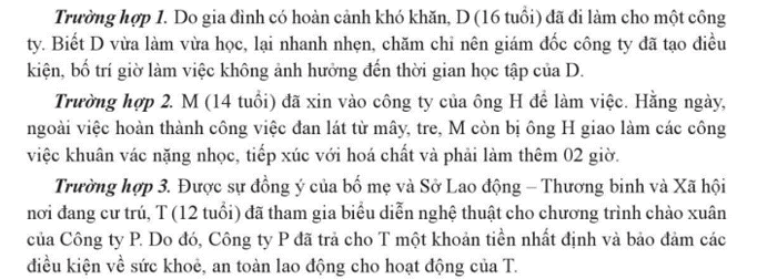- Trường hợp 3. Công ty P đã thực hiện đúng các quy định về nguyên tắc sử dụng lao động chưa thành niên (tại điều 144 Bộ luật Lao động năm 2019).