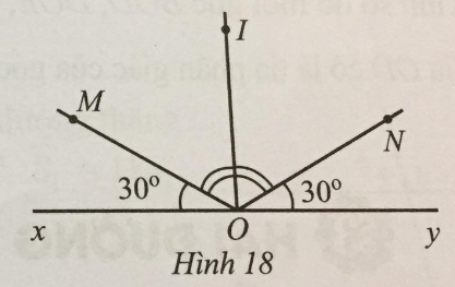 Ở Hình 18 có \(\widehat {xOM} = \widehat {yON} = 30^\circ \), OI là tia phân giác của góc MON. Hai đường thẳng OI, xy có vuông góc với nhau hay không?