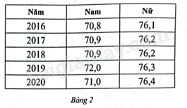 Biểu đồ cột kép ở Hình 29 cho biết tuổi thọ trung bình của nam và nữ người Việt Nam ở các năm 2016, 2017, 2018, 2019, 2020.