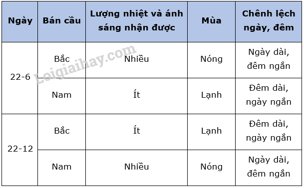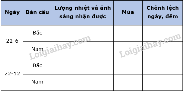 Hãy điền nội dung thích hợp vào bảng sau về hiện tượng ngày, đêm dài, ngắn theo mùa.