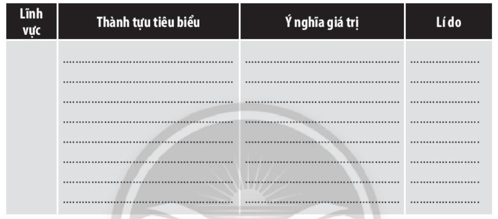 Câu 1. Hoàn thành bảng thống kê một thành tựu của văn minh thời Phục hưng còn ý nghĩa giá trị đến ngày nay. Giải thích lí do sự lựa chọn của em.