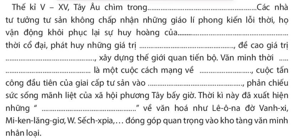Thế kỉ V – XV, Tây Âu chìm trong đêm trường trung cổ. Các nhà tư tưởng tư sản không chấp nhận những giáo lí phong kiến lỗi thời, họ vận động khôi phục lại sự huy hoàng của văn hóa Hy Lạp – La Mã, đề cao giá trị nhân văn, khoa học, xây dựng thế giới quan tiến bộ. Văn minh thời Phục hưng là một cuộc cách mạng về văn hóa, cuộc tấn công đầu tiên của giai cấp tư sản vào trật tự phong kiến, phản chiếu sức sống mãnh liệt của xã hội phương Tây bấy giờ. Thời kì này đã xuất hiện những “người khổng lồ” về văn hóa như Lê-ô-na đờ Vanh-xi, Mi-ken-lăng –giơ, W.Sếch-xpia,… đóng góp quan trọng vào kho tàng văn minh nhân loại.