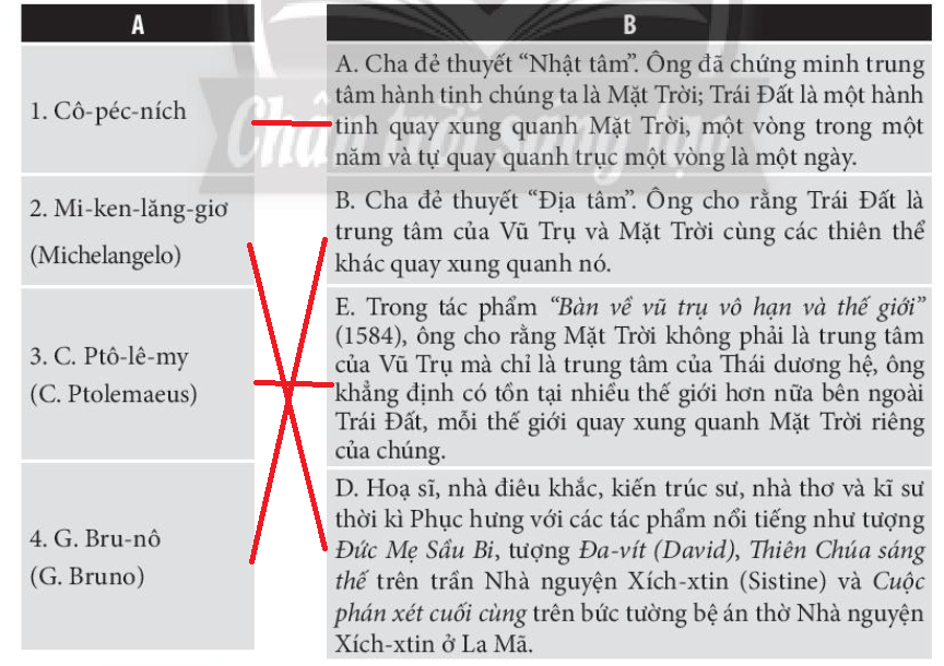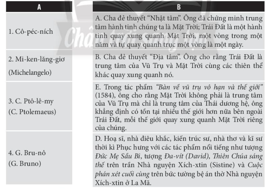 Câu 4. Nối cột A (tác giả) với cột B (thành tựu) để làm rõ những thành tựu tiêu biểu của các nhà khoa học thời Phục hưng.