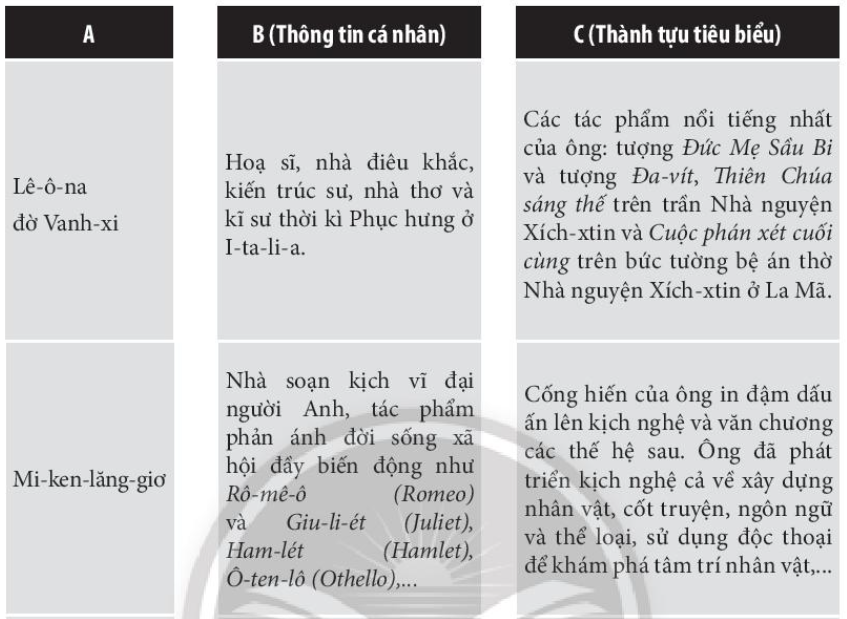 2. Mi-ken-lăng-giơ (cột A) – Họa sĩ, nhà điêu khắc, kiến trúc sư…. (cột B) – Các tác phẩm nổi tiếng nhất của ông: Đức Mẹ sầu bi….. (cột C)