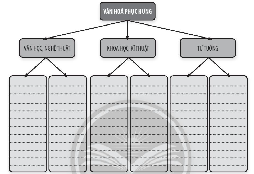 Câu 6. Hoàn thành sơ đồ để làm rõ các nội dung, thành tựu, ý nghĩa của văn hóa Phục hưng.