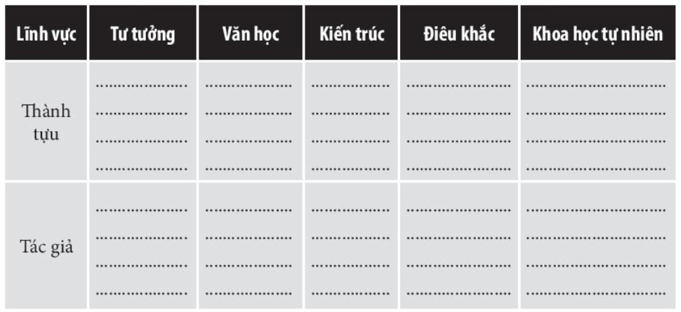 Câu 7. Hoàn thành bảng thống kê dưới đây về các thành tựu văn minh thời Phục hưng.