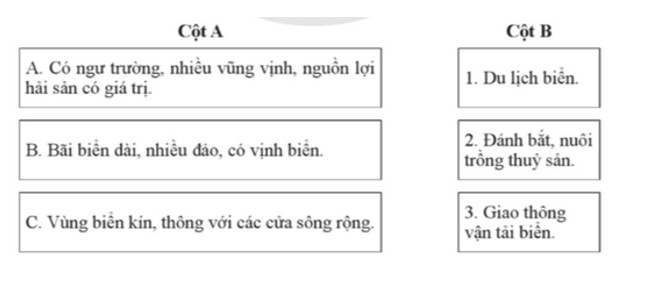 Nối ý ở cột A với ý ở cột B sao cho đúng với tiềm năng phát triển các ngành kinh tế biển ở vùng Đồng bằng sông Hồng.