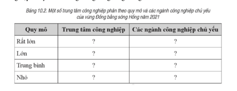Bảng 10.2. Một số trung tâm công nghiệp phân theo quy mô và các ngành công nghiệp chủ yếu của vùng Đồng bằng sông Hồng năm 2021