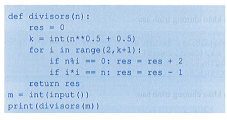 Ước thực sự của số nguyên dương n là các ước nguyên dương khác l và n. Xây dựng hàm divisors với tham số là số nguyên dương n và trả về số lượng ước thực sự của n, (0 ≤ n ≤ 1012). Viết chương trình nhập vào số nguyên dương n từ bàn phím, (0 ≤ n ≤ 1012), sử dụng hàm đã xây dựng đưa ra màn hình số ước thực sự của n.