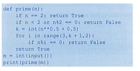 Số nguyên tố là số nguyên lớn hơn 1, chỉ chia hết cho 1 và chính nó. Xây dựng hàm prime kiểm tra số nguyên không âm n (0 ≤ n ≤ 1012) có phải là số nguyên tố hay không, trả về True nếu n là số nguyên tố và False trong trường hợp ngược lại. Viết chương trình nhập số nguyên không âm n (0 ≤ n ≤ 1012) vào từ bàn phím, sử dụng hàm đã xây dựng đưa ra màn hình kết quả kiểm tra n có phải là số nguyên tố hay không.