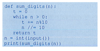 Xây dựng hàm sum_ digits tính tổng các chữ số của số nguyên dương n. Viết chương trình nhập số nguyên không âm n từ bản phím, sử dụng hàm đã xây dựng đưa ra màn hình tổng các chữ số của n.