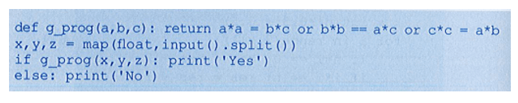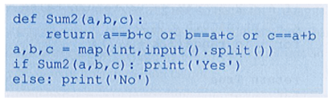 Viết chương trình nhập từ bàn phím ba số nguyên trên cùng một dòng, các số cách nhau ít nhất một dấu cách, sử dụng hàm đã tạo để kiểm tra trong ba số này có số nào là tổng hai số còn lại hay không và đưa ra thông báo “Yes” hoặc “No” tương ứng.