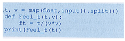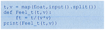 Xét bài toán: Nhiệt độ cảm nhận trên da người tỉ lệ nghịch với bình phương của tốc độ gió tính theo m/s thổi qua bề mặt da. Hãy viết chương trình nhập nhiệt độ thật t°C và tốc độ gió v m/s, tính nhiệt độ cảm nhận của con người dựa theo hàm xác định nhiệt độ cảm nhận theo t và v. Hãy thực hiện chương trình sau với t = 24oC và v = 2 m/s. Cho biết kết quả mà hệ thống đưa ra.