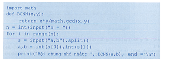 Xây dựng hàm tìm bội chung nhỏ nhất (BCNN) của hai số nguyên dương x và y. Viết chương trình đưa ra bội chung nhỏ nhất của một số cặp số nguyên dương a, b với dữ liệu nhập vào từ bàn phím.