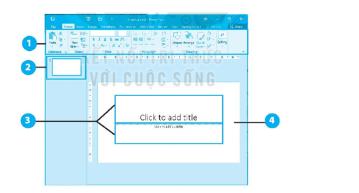 Hãy quan sát màn hình làm việc của phần mềm trình chiếu và điền số vào ô trống tương ứng với tên các thành phần.