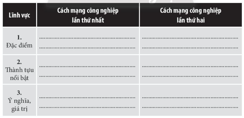 Câu 5. Hoàn thành bảng thống kê hai cuộc cách mạng công nghiệp thời cận đại theo các tiêu chí dưới đây: