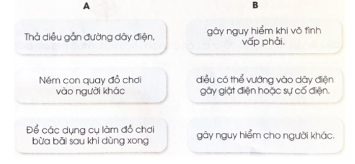 Hãy nối thông tin ở cột A với thông tin cột B cho phù hợp để nói về các tình huống làm và sử dụng đồ chơi dân gian không an toàn.