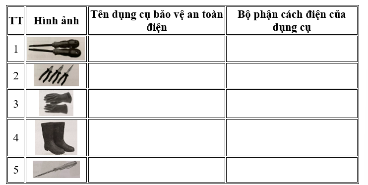 Quan sát hình ảnh, nhận biết tên và bộ phận cách điện của dụng cụ bảo vệ an toàn điện và hoàn thiện bảng.