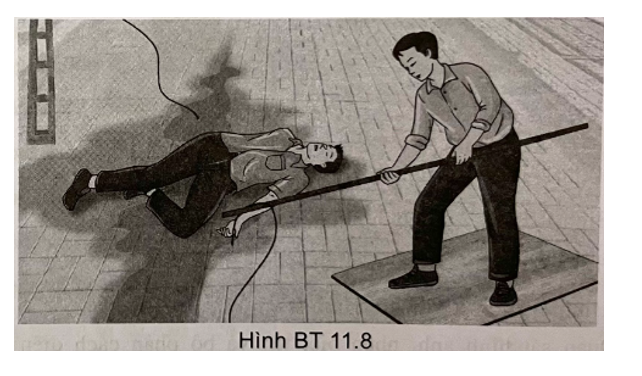 Trong hình BT 11.8, người cứu nạn nhân dùng những dụng cụ bảo vệ an toàn điện nào để tách nạn nhân ra khỏi nguồn điện?