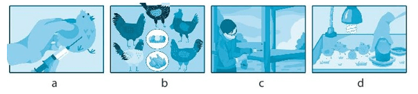 Quan sát các hình ảnh dưới đây và khoanh tròn vào trình tự sắp xếp hợp lí các công việc chăn nuôi