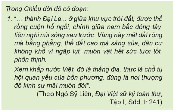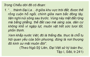 2. Khai thác tư liệu 1, tìm những từ, cụm từ miêu tả về thành Đại La. Những thông tin đó chứng tỏ điều gì về vùng đất này? Từ đó, hãy cho biết ý nghĩa của sự kiện dời đô của Lý Công Uẩn.