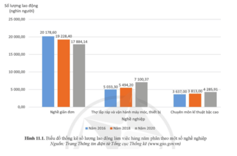 Theo biểu đồ hình 11.1, số lượng lao động làm việc trong nghề đơn giản chiếm phần lớn, lượng lao động làm bên lắp ráp, vận hành máy móc, thiết bị và nghề thuộc chuyên môn kĩ thuật bậc cao ít hơn nhiều, chênh lệch nhau không đáng kể.