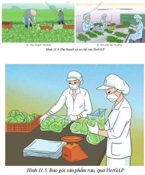 Em hãy quan sát hình 11.4, 11.5 và chỉ ra những điểm làm theo đúng tiêu chuẩn VietGAP trong khâu thu hoạch và xử lí sau thu hoạch sản phẩm trồng trọt.