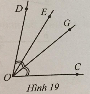 Ở Hình 19 có \(\widehat {COD} = 80^\circ ,\widehat {COE} = 60^\circ \), tia OG là tia phân giác của góc COD.