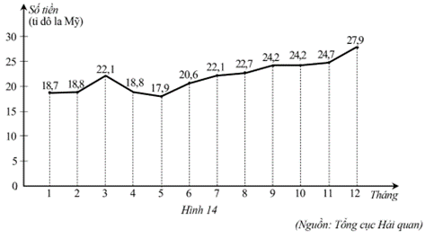 Biểu đồ đoạn thẳng ở Hình 14 biểu diễn giá trị nhập khẩu hàng hoá của nước ta theo từng tháng trong năm 2020.
