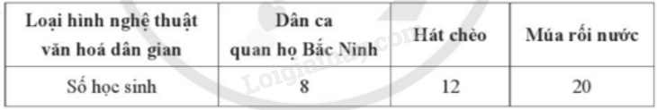 Số lượng học sinh lớp 9A yêu thích loại hình nghệ thuật văn hoá dân gian Dân ca quan họ Bắc Ninh, Múa rối nước, Hát chèo lần lượt là: 8; 20; 12.