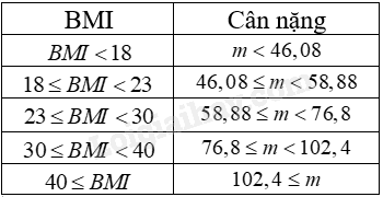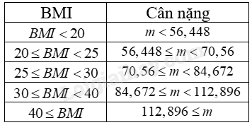 Chỉ số khối cơ thể, thường được biết đến với tên viết tắt BMI (tiếng Anh là Body Mass Index) cho phép đánh giá thể trạng của một người là gầy, bình thường hay béo. Chỉ số khối cơ thể của một người được tính theo công thức sau: \(BMI = \frac{m}{{h{}^2}}\), trong đó m là khố lượng cơ thể tính theo kilôgam, h là chiều cao tính theo mét.