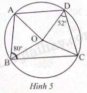 Cho tứ giác ABCD nội tiếp đường tròn (O) có (widehat {ABC} = {80^o}) và (widehat {CDO} = {52^o}) (Hình 5).