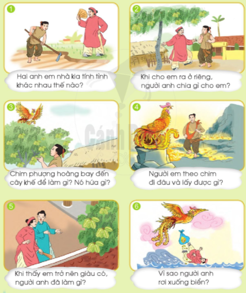 Tranh 1: Hai anh em nhà kia tính tình khác nhau. Người anh tham lam còn người em thì thật thà, hiếu thảo