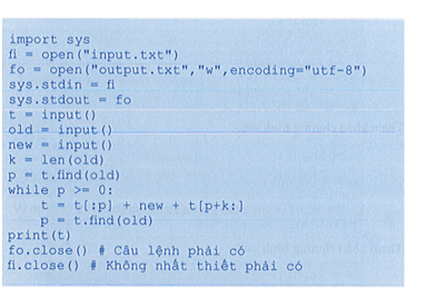 a) Xét bài toán: Cho văn bản t. Tìm và thay thế xâu con old bằng xâu con new trong t. Việc thay thế sẽ được thực hiện cho đến khi văn bản không còn chứa old. Viết chương trình nhập xâu t vào từ bản phím và thực hiện bài toán trên.