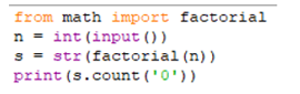 Xét bài toán: Cho số nguyên dương n. Hãy xác định số chữ số 0 có trong dạng biểu diễn thập phân của n giai thừa. Viết chương trình nhập vào số nguyên dương n từ bàn phím và thực hiện bài toán trên.