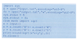 Thuyền trưởng Flint cho tàu ghé lại một hòn đảo để chôn dấu bớt vàng bạc châu báu cướp được. Để giữ bí mật nơi chôn kho báu, sau khi xuống tàu, Flint dẫn thuộc hạ đi về phía trước, được một đoạn ra lệnh rẽ phải hoặc trái rồi đi tiếp, theo hướng nhìn. Một thuộc hạ của Flint đã bí mật ghi lại đường đi dưới dạng xâu kí tự từ tập {E, N, W, S}, mỗi kí tự tương ứng với một hướng đi (Đông, Bắc, Tây, Nam) và tương ứng với một đơn vị độ dài của đường đi. Cho biết xâu ghi nhận đường đi. Hãy viết chương trình xác định khoảng cách từ bến tàu đến nơi chôn kho báu và đưa ra với độ chính xác đến hai chữ số thập phân sau dấu phẩy.