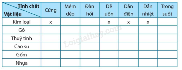 Em hãy liệt kê tính chất của các vật liệu theo mẫu dưới đây: