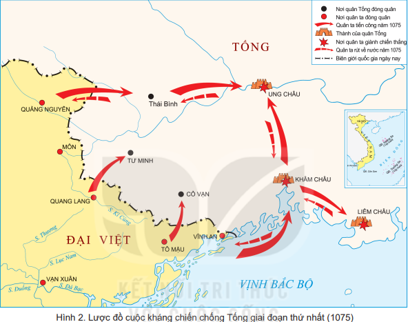 + Quan sát Hình 2. Lược đồ cuộc kháng chiến chống Tống giai đoạn thứ nhất (1075). Qua đó thấy được các hướng tiến công và mục tiêu của quân nhà Lý.