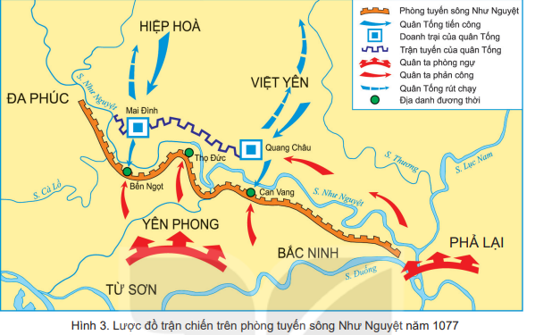 + Quan sát Hình 3. Lược đồ trận chiến trên phòng tuyến sông Như Nguyệt năm 1077. Qua đó thấy được chiến lược, mục tiêu của Lý Thường Kiệt.