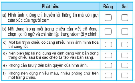 Đọc kĩ các ý trong bảng và dựa vào kiến thức đã học để đánh dấu vào ô tương ứng.
