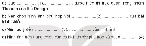 Em hãy điền các cụm từ: chủ đề, bản quyền, vị trí hợp lý, mẫu định dạng vào chỗ trống (…) được đánh số trong các câu sau để được phát biểu đúng.