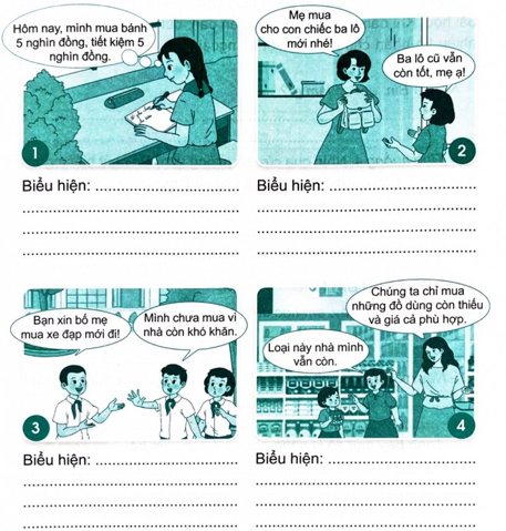 + Tranh 1: đây là biểu hiện của việc sử dụng tiền hợp lí vì khi không sử dụng hết tiền, bạn nữ đã biết tiết kiệm tiền còn lại.