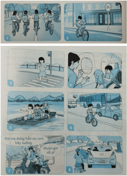 - Tranh 8: Không mở cánh cửa ô tô phía bên trái khi đang tham gia giao thông, phải quan sát xung quanh trước khi mở cửa xe.