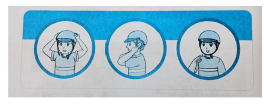 Em hãy mô tả các bước đội mũ bảo hiểm theo tranh gợi ý.