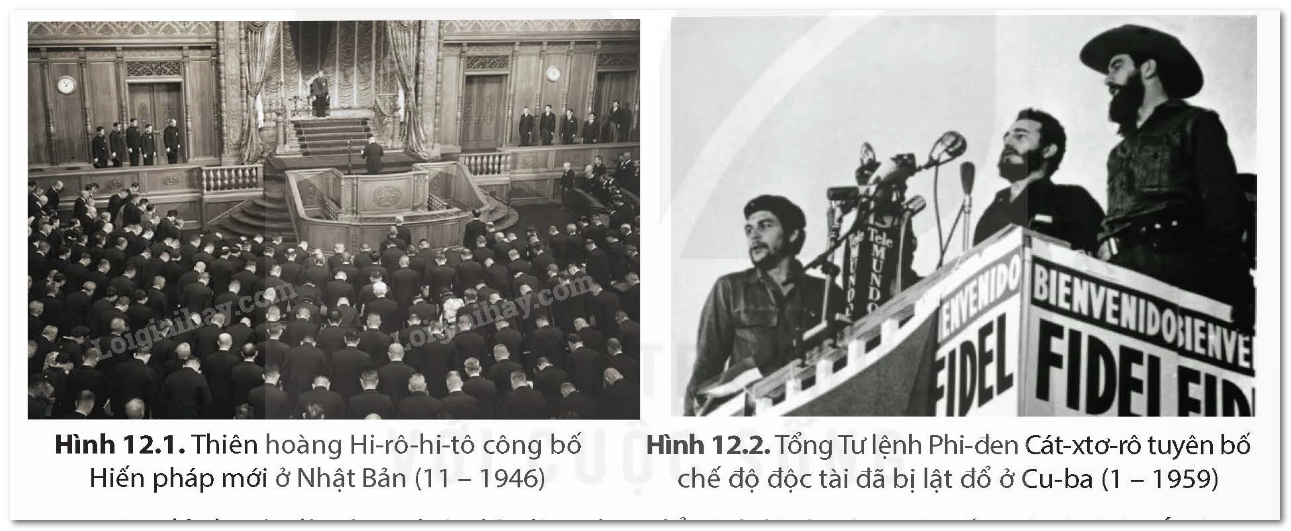- Hình 12.1: Thiên hoàng Hi-rô-hi-tô công bố bản Hiến Pháp mới do Hoa Kỳ soạn thảo và được sự thông qua của Quốc Hội Nhật Bản, chủ quyền được chuyển giao hoàn toàn cho nhân dân, còn Thiên Hoàng chỉ là một biểu tượng của dân tộc